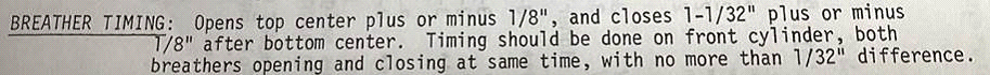 The breather timing results agree very favorably with the factory specifications, especially in light of the factory specification allowing a difference in piston position of + 1/8“. One other consideration relating to this test is the difficulty in visually determining exactly when the breather valve opening and closing occur, because the overlap of 2 identical circles occurring down a small dark hole makes it very difficult to define the exact instant overlap begins and ends, even with excellent illumination.