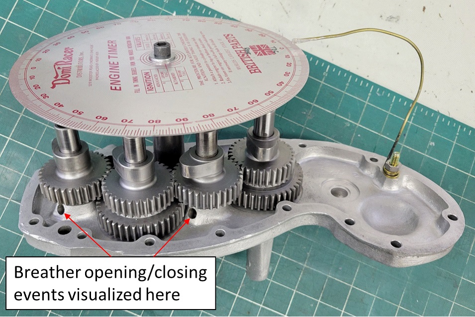To visually assess VL breather timing requires a clear line of sight to the holes in the cam cover where #1 and #3 camshafts rotate and result in opening/closing events. Such visual observations can occur only if the cam cover is removed from the engine with properly timed cams and pinion gear present. The bullet points below describe the test rig employed and the general procedure for determining the crankshaft angle at which breather opening/closing events occur.