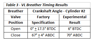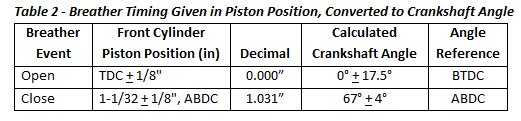 The timing disk was rotated in the direction of engine operation and the crankshaft angle at which opening/closing events occur was recorded. Table 3 shows the factory-specified breather timing and breather timing results recorded with the test fixture.