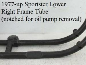 - 1977-Up lower right tube is notched to allow the (new in 77) gerotor style oil pump to be removed and installed without removing the engine.