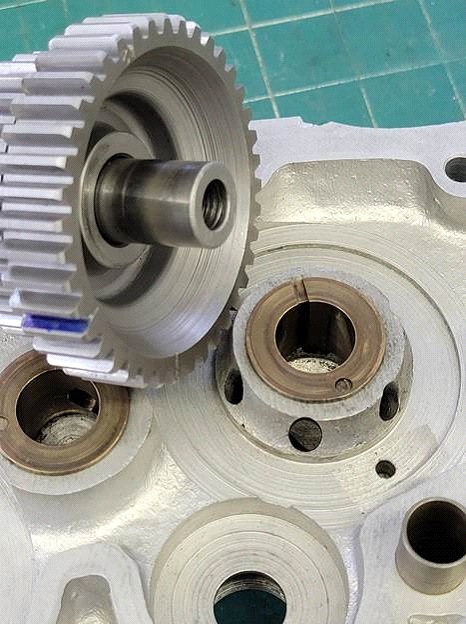 Note that the cam bushings as well as the pinion bushing have grooves across their top edge. When the pistons descend on the downstroke and create positive pressure in the crankcase, air/oil mist is blown out of these grooves into the cam chest where it lubricates all the components therein. In addition to the grooved bushings, there is a 1/8” hole forward of the #4 cam bushing that also passes air/oil mist to the cam chest.
