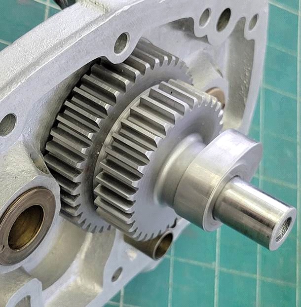Figures 4 and 5 show the pinion bushing having 2 gravity feed holes above the bushing (one on the flywheel side and one on the cam side of the case) as well as a broached full-length groove along it's top side. Figure 6 is a magnified view of the pinion bushing and groove therein.