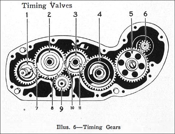 The procedure to determine breather timing begins with the cam installation process, since we are correlating the camshaft angle (breather hole timing) to the crankshaft angle. Figure 12, from the 1934-36 Rider’s Hand Book, shows the typical appearance of pinion and camshaft gear timing marks when a 4-cam Harley is timed correctly.