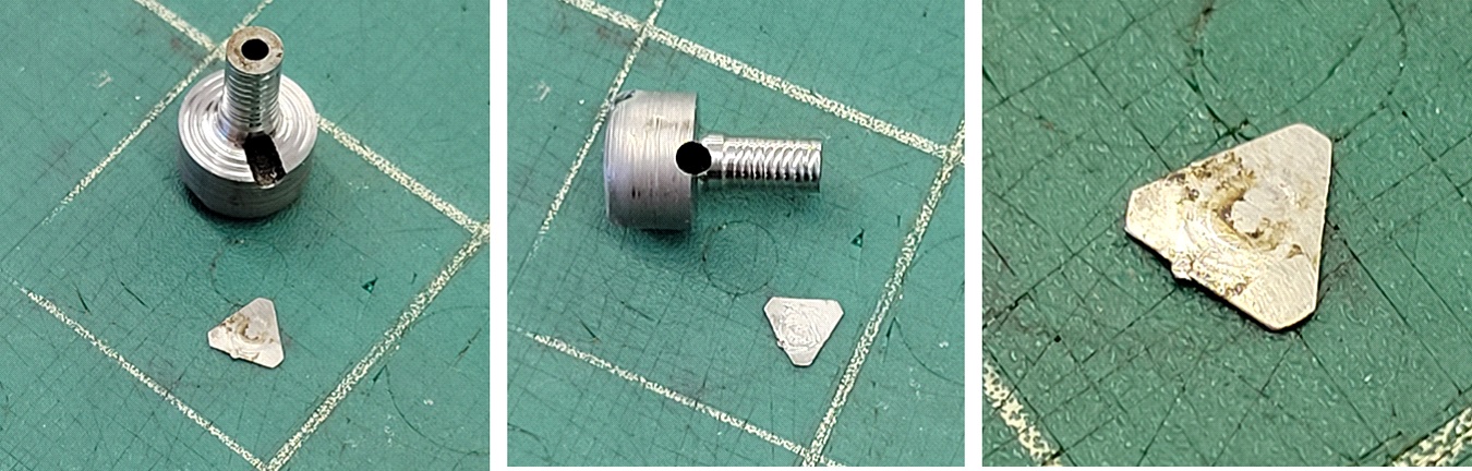 The valve body is a steel slug with a screwdriver slot on one end and a 1/8” NPT-27 male thread on the other end. The valve body is relieved on the threaded end to provide a cavity in which the flutter element resides. The body has a 0.074“ dia hole drilled axially from the threaded end, the full length of the threaded section. Just below the threads, a cross-drilling intersects the central drilling. The small flutter element, a triangular-shaped piece of stainless steel ~ 0.009” thick, that measures ~ 0.225” corner to corner, is secured/swaged in the cavity where it opens and closes in response to changes in crankcase pressure.