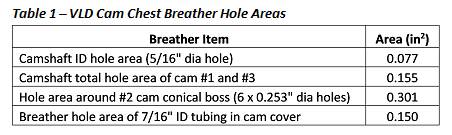 Another observation of the VL breathing system relates to the various “breather hole areas” relative to one another, i.e., the x-sectional area of holes in the camshafts relative to the area of the 6 holes around the #2 cam boss and the area of the 7/16” dia tube that allows air to exit the cam cover to the primary chain. Table 1 below shows the area of the subject holes. Interestingly, the 2 camshafts introducing air to the cam cover are nearly identical in area to the 7/16“ tube that allows air to exit the cam cover. However, the 6 holes at the #2 cam boss, that convey air from the cam cover to the rear chamber, have ~ 2X the area of either the hollow camshafts or the 7/16” tube exiting the cover. It is presumed that the 2X extra area behind the #2 cam exists to both 1) allow the air to slow down and be demisted via #2 cam centrifugal slinger action, and 2) provide full radial access to the 6 holes behind the #2 cam.