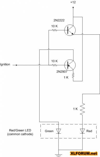 The idea was to isolate the current draw of the LED from the ignition and use a dual color LED for an indicator light for both curves.
