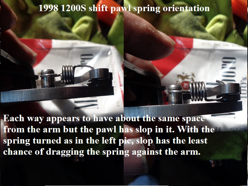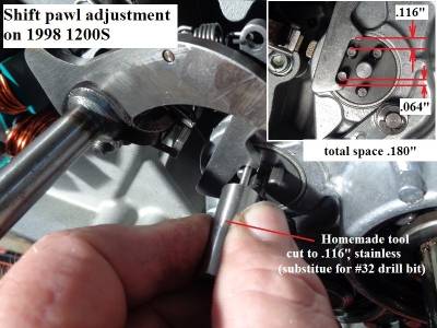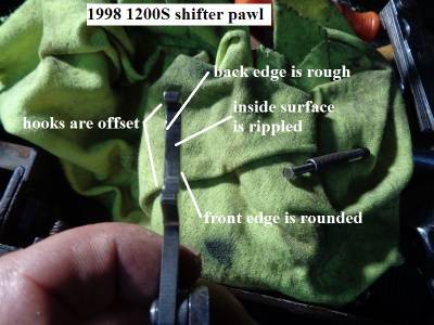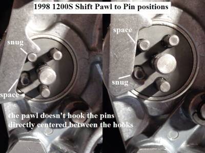However, when the shifter shaft is turned one way or the other, the pawl doesn't hook the pins directly centered between the hooks on the pawl.