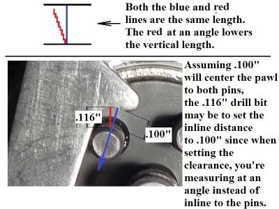 To center the pawl between the pins would take a .090“ drill bit or pin for the equal distance top and bottom.