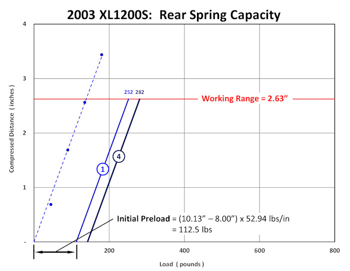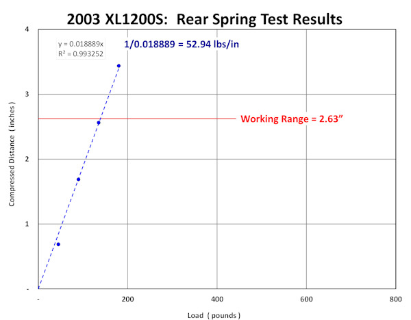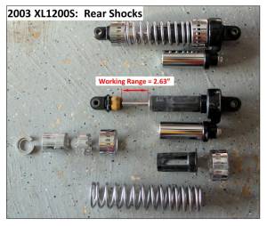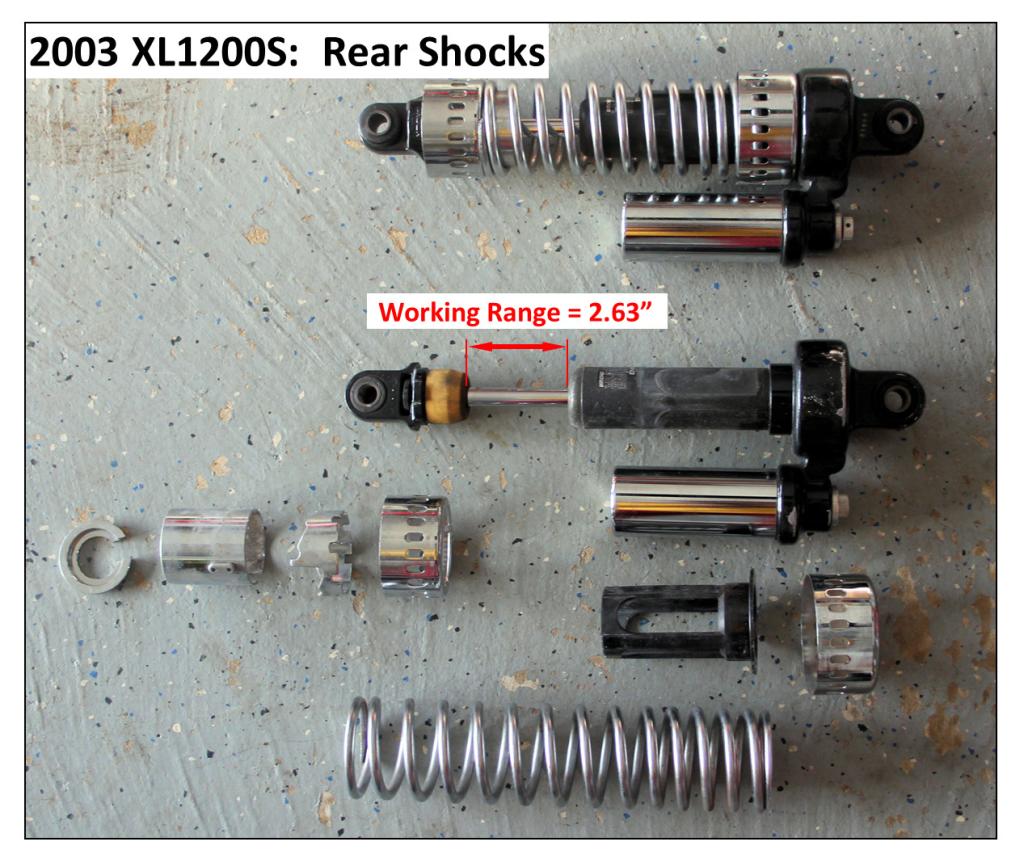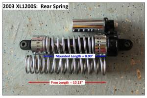 • 2007 Harley 1200 Low Springs 100 pounds per inch progressive wound (but built by Harley to go progressive too late to help much. It goes to hard rate at a spring height of 6” or a shock length of about 10.5“) 46)