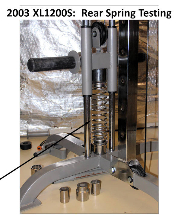 XL1200S rear shock disassembled 24)Spring testing using home gym equipment 25)Test results 26)