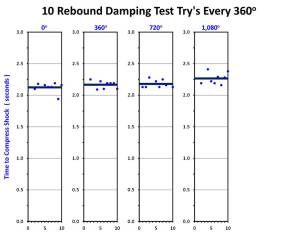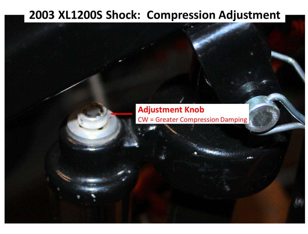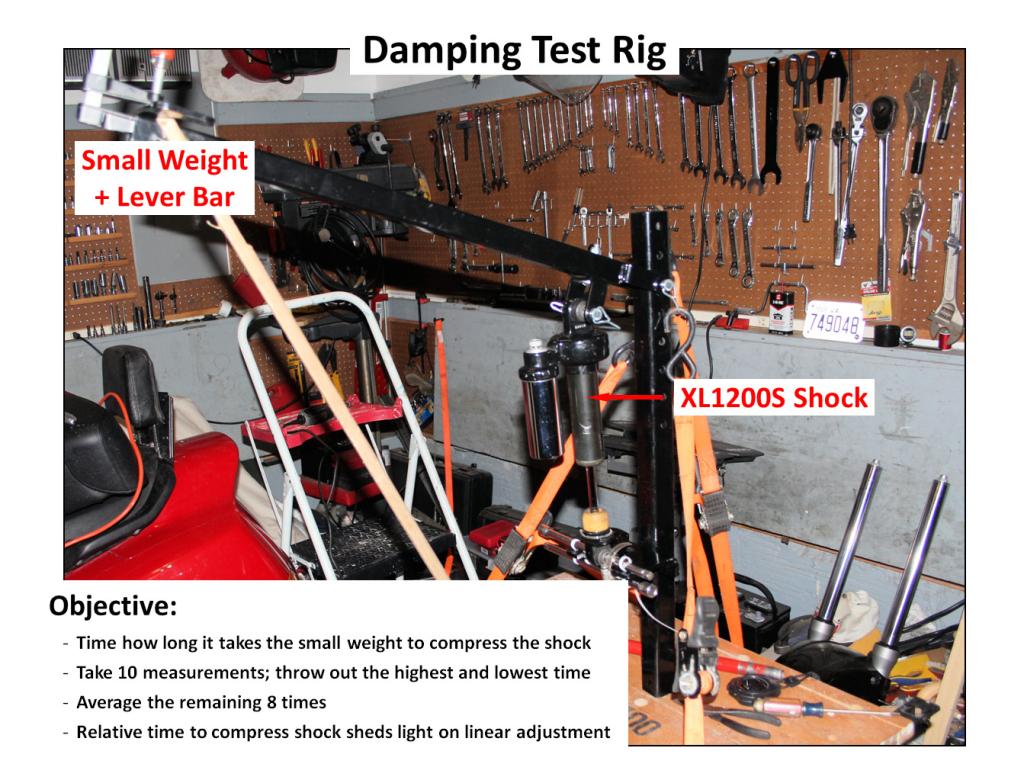 • I found I can use one of my shock compression tools to test the shock (minus the spring) to see what the characteristic of the [compression and rebound] damping adjustments are on a shock. I use a stopwatch to see how long it takes to compress the shock for a given dial setting. The relative time comparison between compression and rebound times allow you to pick a strategy to get to a 2.5 to 1 or maybe as high as 3 to 1 (this is more of a cruiser than a knee dragging ride).