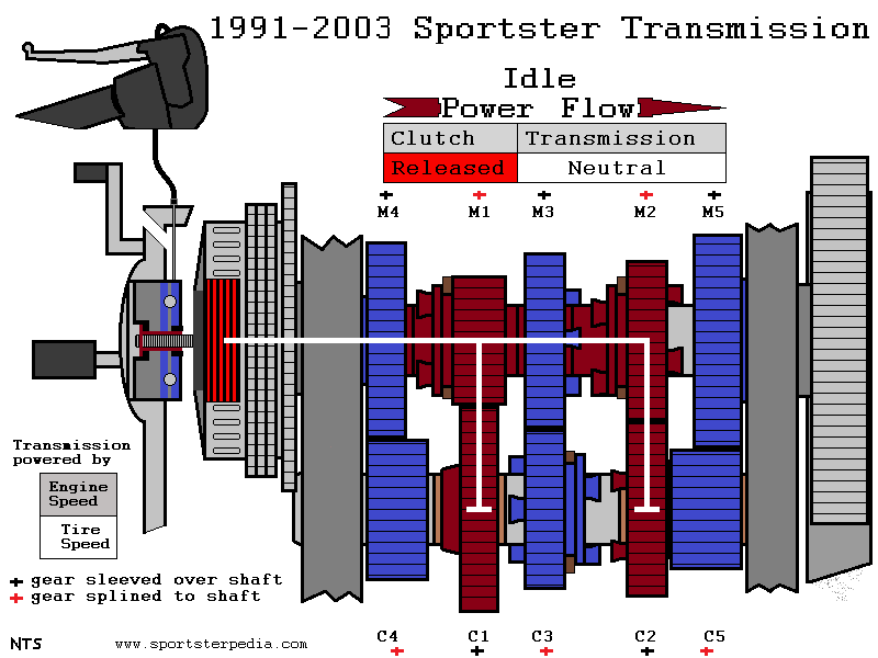 A chart for neutral is included below since, technically, power flows from the 2 SPLINED gears to the 2 SLEEVED gears when the clutch is engaged, although power ends there.